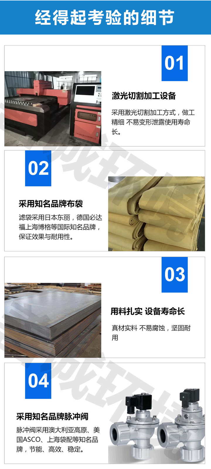 (5)采用玻璃纖維、聚四氟乙烯、P84等高溫濾料時,可在200℃以上的高溫條件下運行。