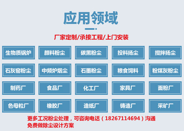 布袋除塵設備主要處理生物質鍋爐煙塵、顏料粉塵、碳黑粉塵、下料混料揚塵、攪拌揚塵、石灰窯粉塵、中頻電爐煙塵、石墨粉塵、造紙廠、磚廠、食品廠、色母粒廠、水泥廠、面粉廠、橡膠廠、木工廠等一系列工況粉塵。