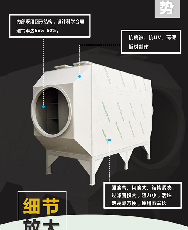 活性炭是一種很細小的炭粒,有很大的表面積,而且炭粒中還有更細小的孔——毛細管.這種毛細管具有很強的吸附能力,由于炭粒的表面積很大,所以能與氣體(雜質)充分接觸,當這些氣體(雜質)碰到毛細管就被吸附,起凈化作用。活性炭吸附的實質是利用活性炭吸附的特性把低濃度大風量廢氣中的有機溶劑吸附到活性炭中 。活性炭吸附法主要用于低濃度氣態污染物的脫除。