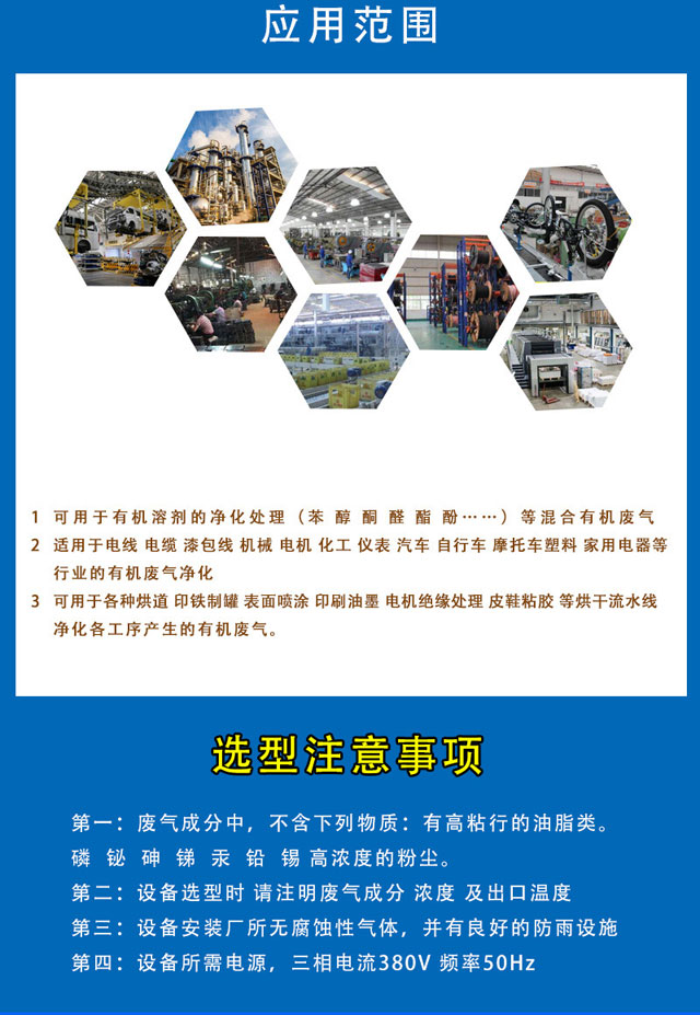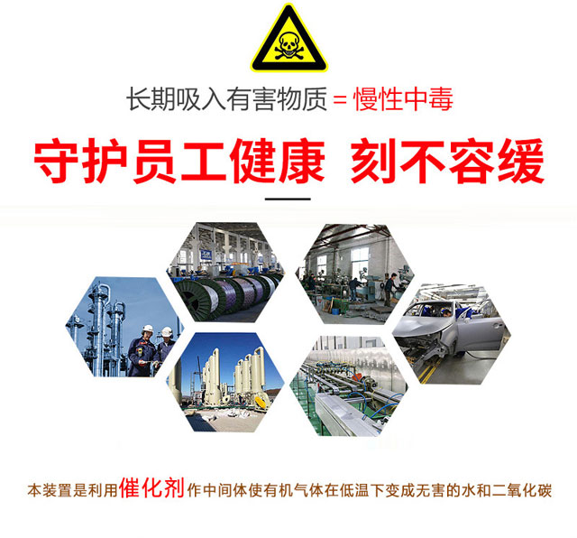 催化燃燒設備以其結構簡單、凈化效率高、節能、二次污染等優點,廣泛應用于線材加工、機械、電機、化工、設備、汽車、發動機、塑料、電器、石油、化工、印染等行業。其他工業有機廢氣處理。如油漆工業中的苯、乙醇、乙酸乙酯、三苯基(苯、甲苯、二甲苯),印刷工業中的異丙醇,電子工業中的乙酸乙酯、甲苯、二氯甲烷,三氯乙烷的吸附回收。此外,還可加工碳氫化合物(芳香烴、烷烴、烯烴)、含氧有機化合物(醇、酮、有機酸等)、含氮有機化合物、硫、鹵素、含磷有機化合物等。