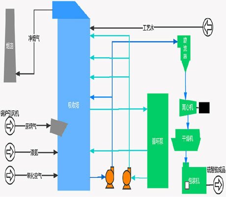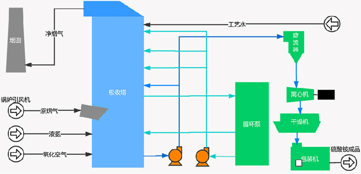 利用氨液吸收煙氣中的SO2生成亞硫酸銨溶液,并在富氧條件下將亞硫酸氨氧化成硫酸銨,再經加熱蒸發結晶析出硫酸銨,過濾干燥后得化肥產品。主要包括吸收過程、氧化過程和結晶過程。